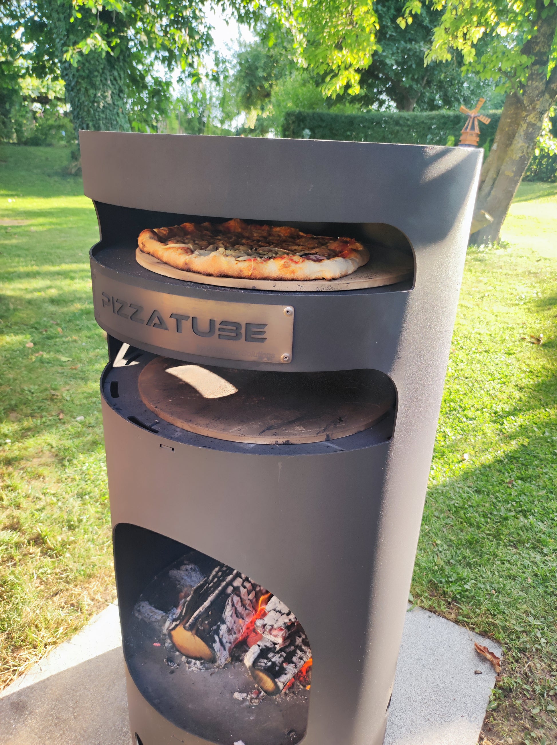 Lieferumfang: Pizzatube aus 3mm Stahlblech. Die Größe und Produktivität sind ideal für den Hausgebrauch. Da die Pizzas hier in nur wenigen Minuten fertig werden, können auch 10-20 Pizzas schnell zubereitet werden, ein zweites Pizzafach ist zur Warmhaltung der Pizza mit einem eigenem Pizzastein vorhanden. Unser Pizzatube ist nicht nur für Pizzas geschaffen worden – man kann hier auch unterschiedliche Brotprodukte backen: Weißbrot, Brot, Ciabatta etc. Dank der offenen Feuerstelle kann dieser Pizzatube auch als Wärmequelle agieren. Maße Pizzaofen: 100 cm (Höhe), 50 cm Durchmesser